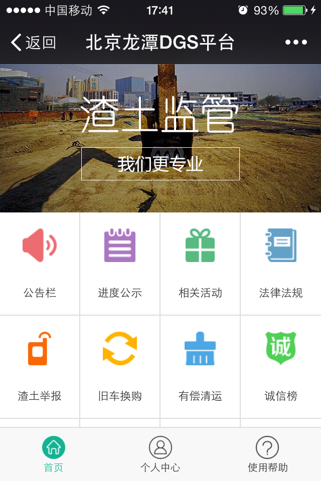 渣土工程微信管理平臺由北京市東城區人民政府龍潭街道辦事處創建和管理,主要功能:辦事處監管轄區裝修垃圾清運并建立清運信用體系;居民登記舊自行車換購和大件舊家具清運需求,辦事處為其提供相關服務;居民公示裝修建材轉讓或需求信息,建立物品循環空間。
